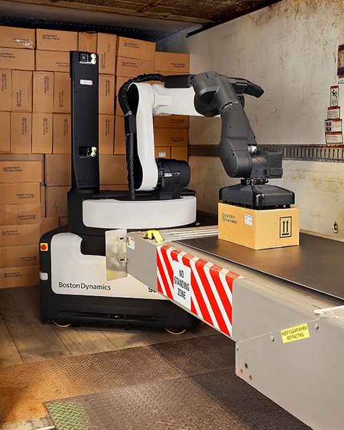 Boston Dynamics’ Stretch™ automates the task of trailer and container unloading, leaving the robot to literally do the heavy lifting. This integrated system encompasses mobility, vision, and gripping, with a mobile base that can travel in any direction, a perception mast housing an advanced vision system and sensors, and a custom lightweight arm outfitted with a powerful vacuum gripper. When set to start, Stretch will autonomously unload all the boxes of a trailer onto a conveyor belt, which typically transits the boxes to a scanning tunnel or sortation systems.