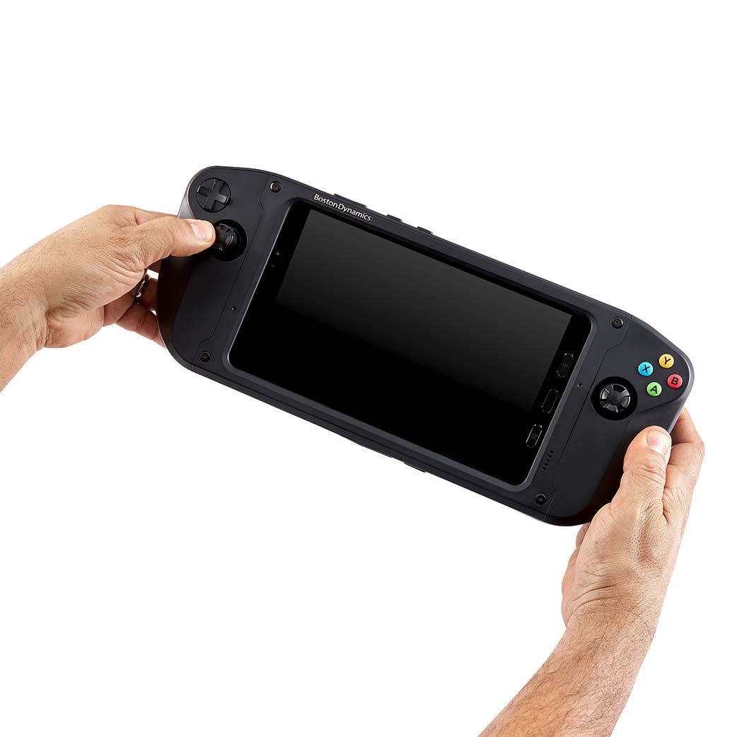 Joysticks, buttons, and bumpers extend tablet touch screen capabilities for a more fluid experience operating Spot.